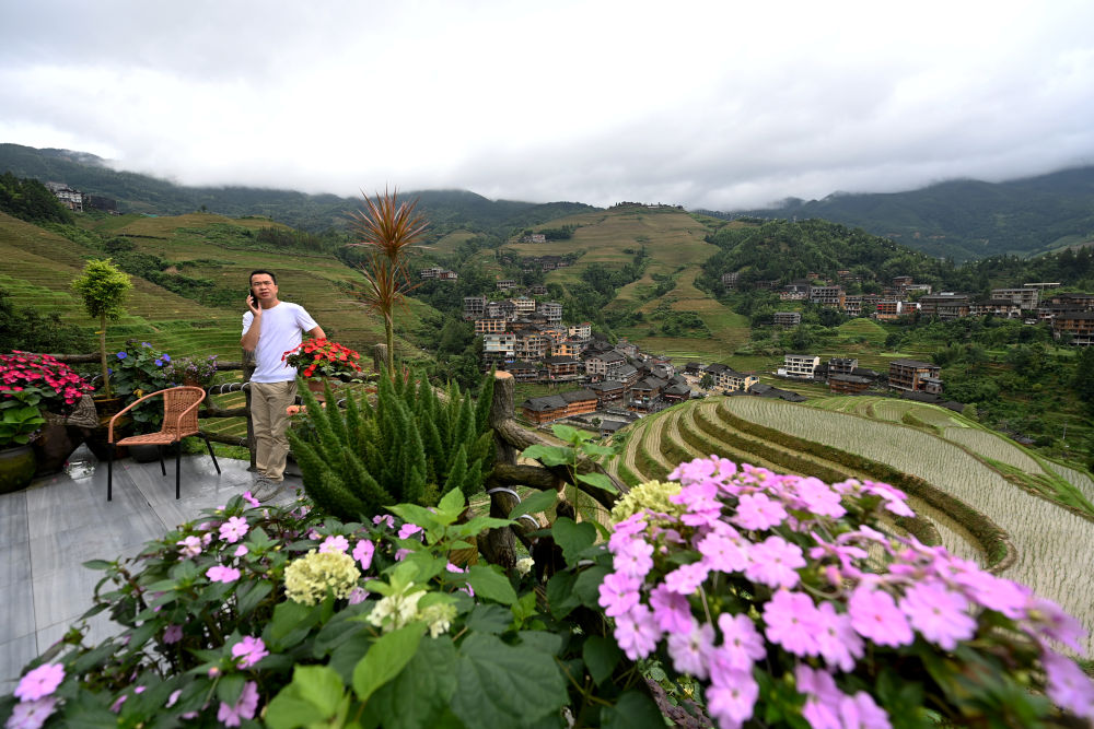 6月27日,大寨村“山中已千年”觀景民宿的負(fù)責(zé)人余瓊通在民宿觀景平臺(tái)聯(lián)系業(yè)務(wù)。
