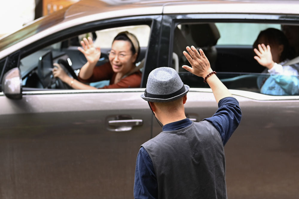 大寨村“陌野·晨曦”民宿管家李濱與游客揮手告別(6月26日攝)。