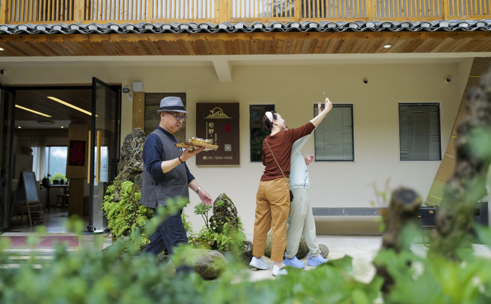 大寨村“陌野·晨曦”民宿管家李濱(左一)為入住的客人送茶水(6月26日攝)。