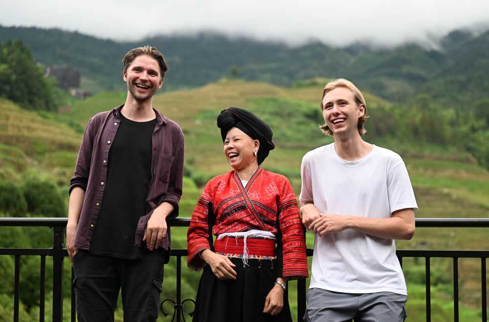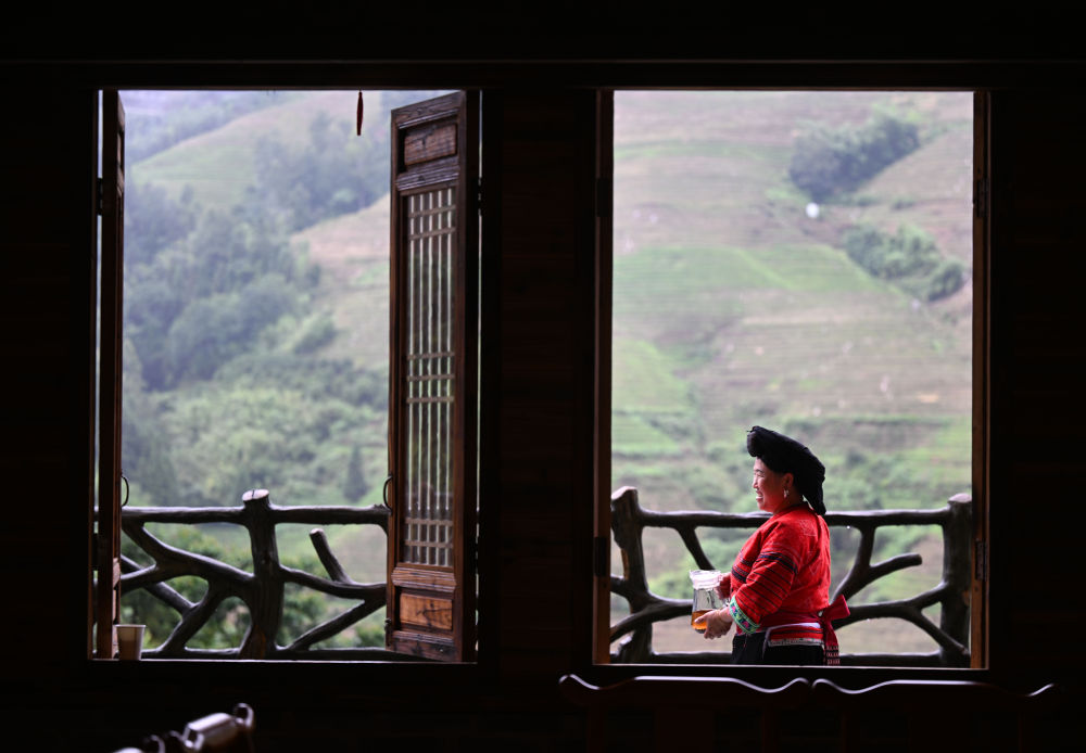 來自德國的游客在大寨村的一家民宿賞景(6月26日攝)。