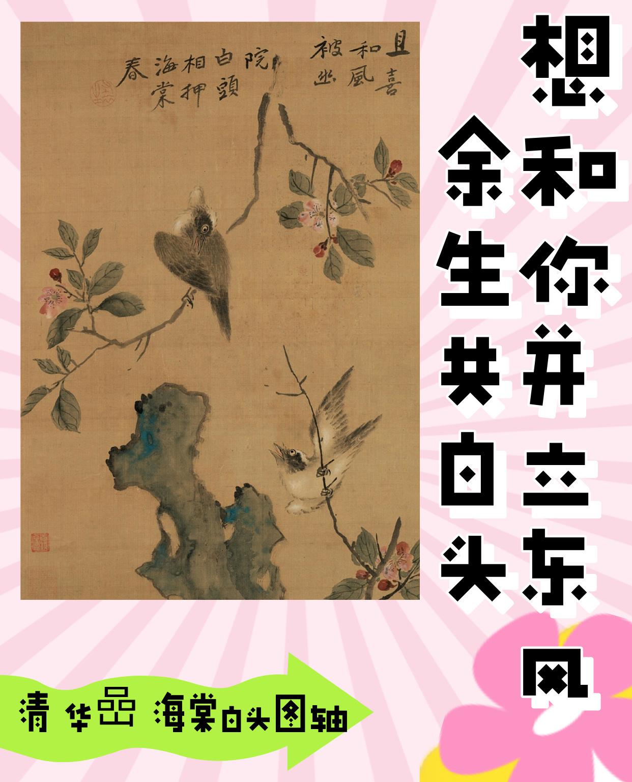 華喦為“揚(yáng)州八怪”之一,擅畫(huà)花鳥(niǎo)。圖中所繪海棠花常在詩(shī)詞中被比作佳麗,白頭翁有“白頭偕老”的寓意,石則寓意堅(jiān)貞剛強(qiáng)、長(zhǎng)長(zhǎng)久久。此作為祝愿婚姻美滿的典型作品。