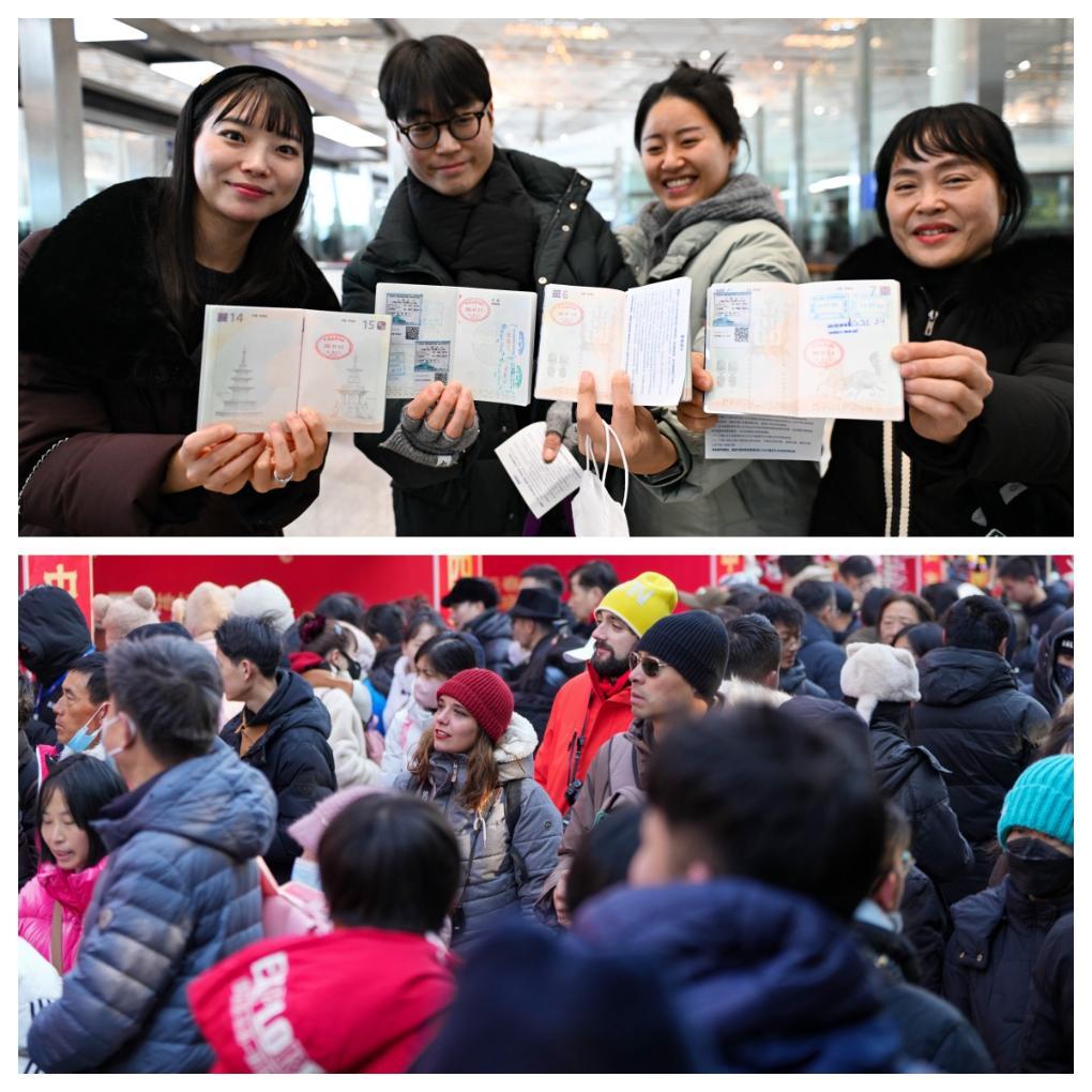 拼圖:(上圖)1月28日,在首都國際機(jī)場(chǎng),四名韓國游客利用免簽政策來中國旅游,他們向記者展示著護(hù)照上的入境章。(下圖)1月29日,兩位來自西班牙的游客在北京地壇廟會(huì)游覽。