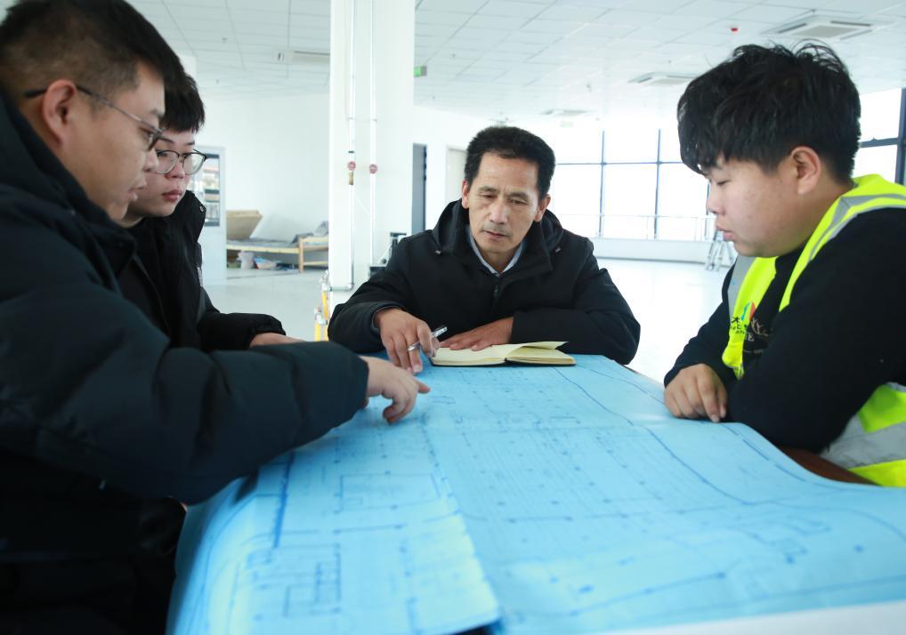 在項(xiàng)目部內(nèi),周培(右二)和工作人員對(duì)工程操作注意事項(xiàng)進(jìn)行研討。(受訪者供圖)