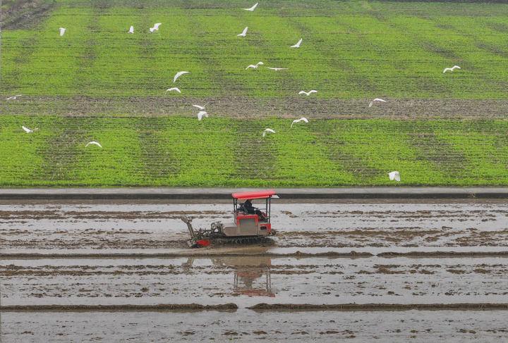 2025年2月25日,在浙江省瑞安市馬嶼鎮儒陽村,農機在田間犁地,白鷺低空而飛(無人機照片)。新華社發(蘇巧將攝)
