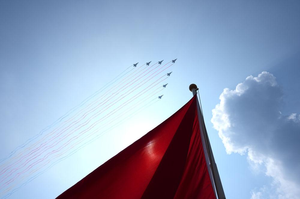 2025年9月3日,紀念中國人民抗日戰(zhàn)爭暨世界反法西斯戰(zhàn)爭勝利80周年大會在北京隆重舉行。這是教練機梯隊接受檢閱。新華社記者 朱崢 攝