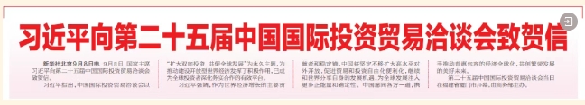 9月8日,第二十五屆中國國際投資貿(mào)易洽談會在廈門開幕,國家主席習(xí)近平向第二十五屆中國國際投資貿(mào)易洽談會致賀信。