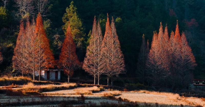 龍棲山的森林康養小鎮是國家級自然保護區、省級森林康養基地,秋季的龍棲山是一年中最絢爛的時節,保護區內著名的水杉大道迎來高光時刻,葉片由綠漸黃轉紅,色彩斑斕,挺拔的樹冠與蜿蜒的道路構成一幅層林盡染的油畫,成為游客爭相打卡的“金色大道”,也被評為“全國百佳紅葉觀賞地”。