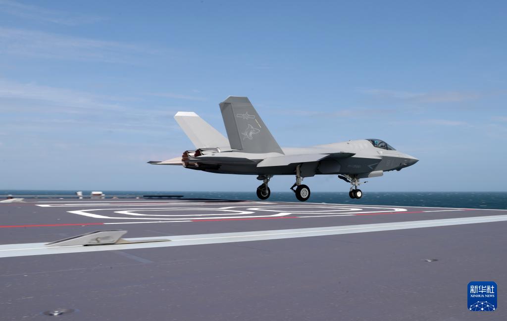日前,海軍福建艦開展入列后首次海上實兵訓練。這是殲-35艦載機彈射起飛。新華社發(王健 攝)