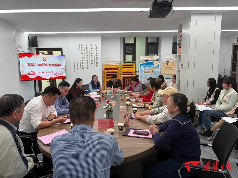 14日,大凰山社區召開座談會,社區工作者、居民代表、配送騎手、社工與志愿者共同學習黨的二十屆四中全會精神,并暢談體會、展望未來。(徐文錦 攝)