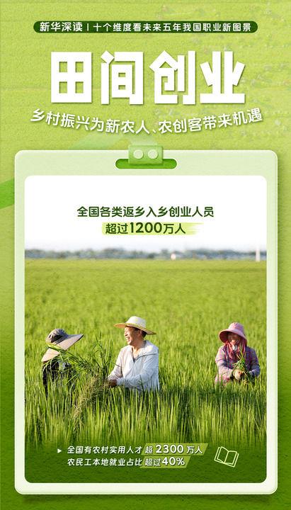 目前全國各類返鄉入鄉創業人員超過1200萬人。越來越多青年大學生、城市白領等把握加快農業農村現代化發展機會,帶著技術、資金等返鄉入鄉創業,涌現出農村集體經濟經理人等新職業。