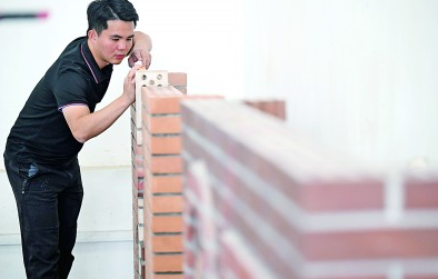 在天津鐵道職業技術學院砌筑集訓基地,教師在給學生示范砌墻的動作要領。新華社發