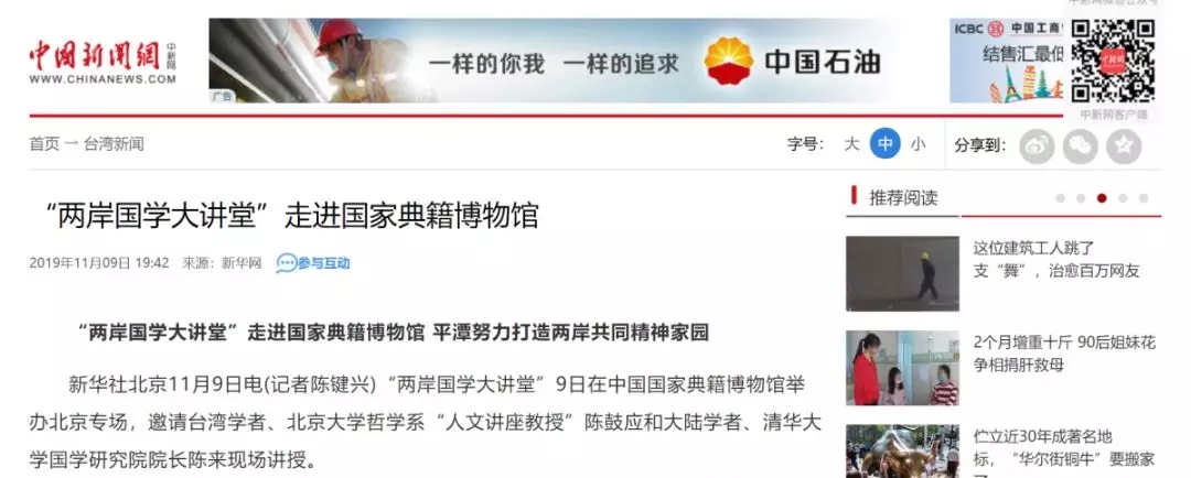 臺灣中時電子報刊發兩岸國學大講堂內容