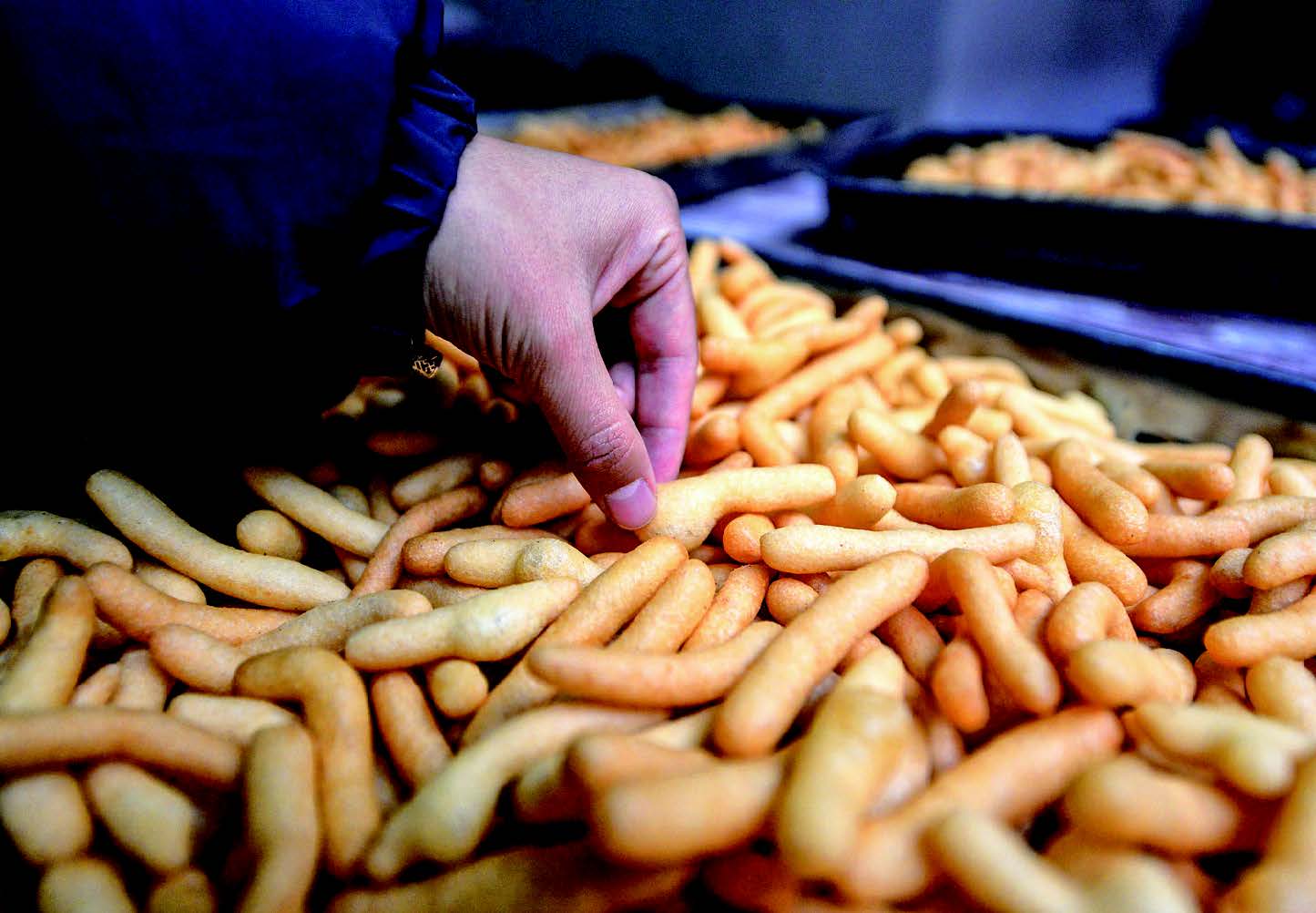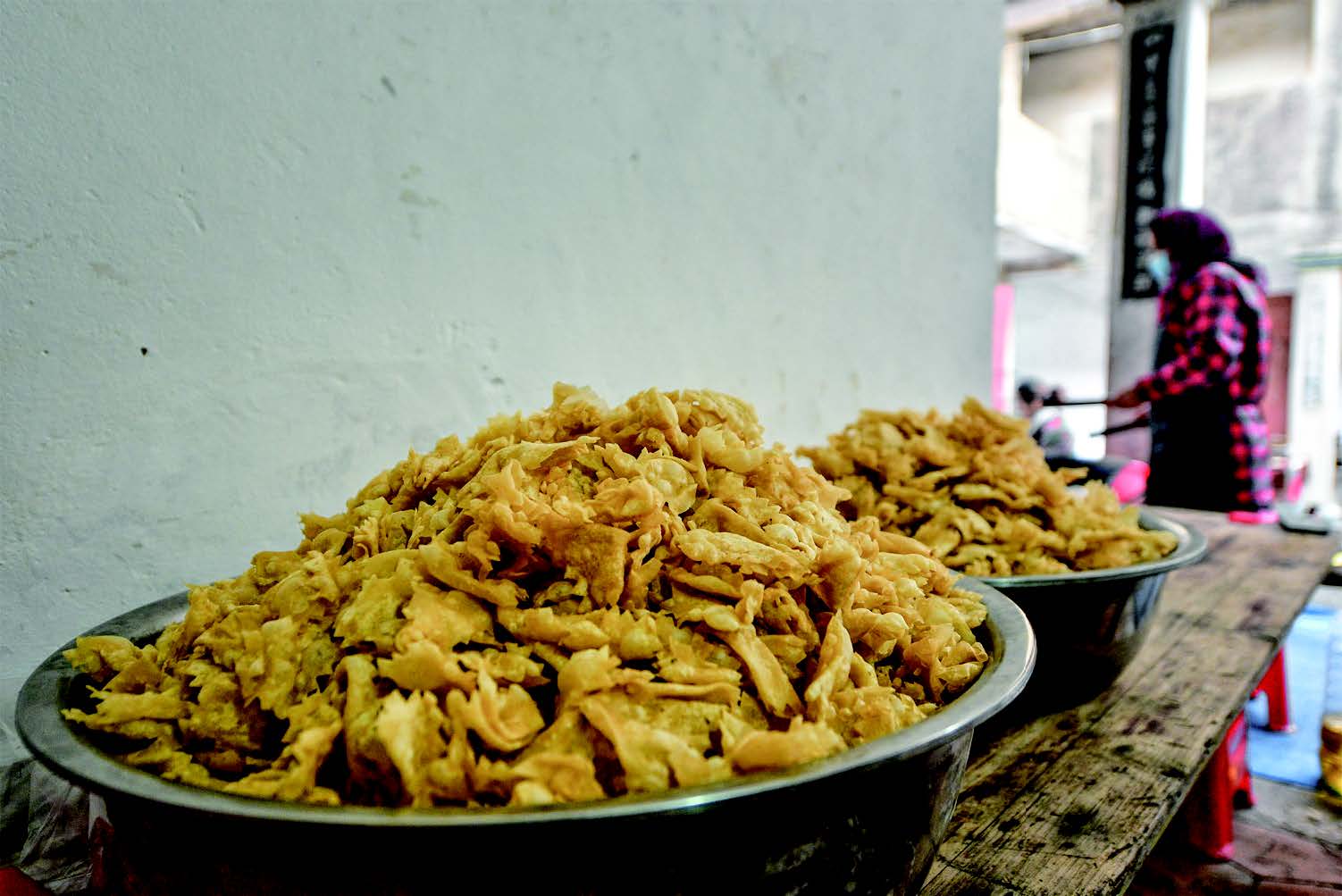 /可可酥。吃可可酥是平潭過年的一種傳統(tǒng)。可可酥在平潭還有個別名叫“茶食仔”,它取材平潭豐富的物產(chǎn)地瓜與地瓜粉,經(jīng)過捶打揉搓,形成面團(tuán)。可可酥的面餅要搟得比“寸棗”薄得多,像紙一樣,經(jīng)過油炸后會格外酥脆好吃。搟好的面餅用刀切成菱形狀便可放進(jìn)鍋里炸,在過去,為了給新年增添花樣,人們會在菱形中間切出兩三道,然后把一個對角捏在一起,炸后的可可酥也顯得造型感十足了。一片片金黃的可可酥,它們凝結(jié)著新年的期盼,喚起了平潭人民兒時的記憶。拈上一節(jié)輕輕一咬,咔嗞作響,傳統(tǒng)的年味也就伴隨著這份香甜在唇齒間彌漫開來。