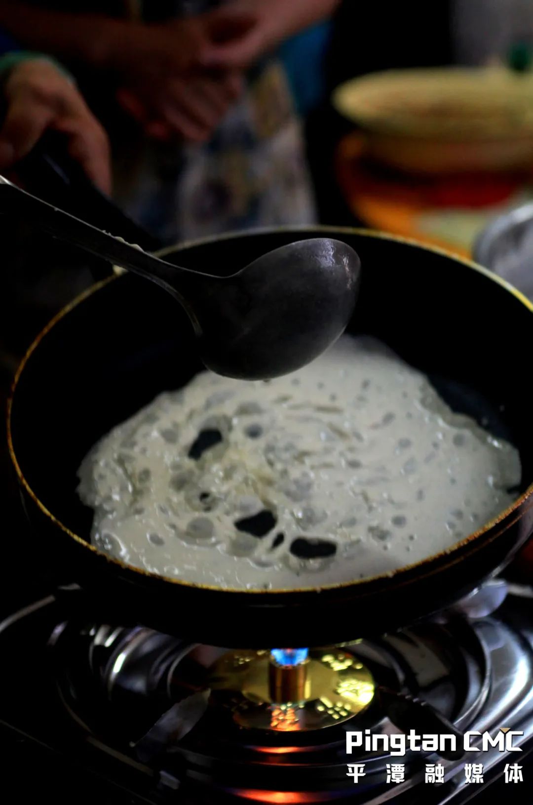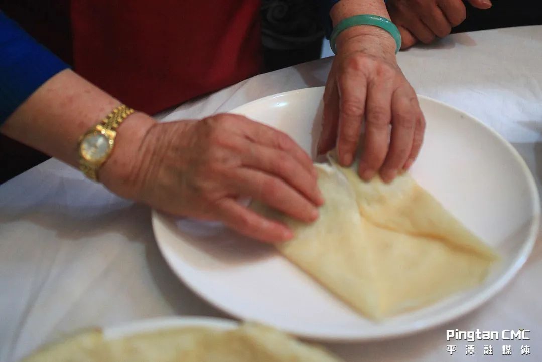 老阿嬤回憶說,以前平潭農(nóng)村都使用土灶。鍋太大,風(fēng)箱燒柴禾,鍋的溫度也很難控制。但是阿姆們自有辦法,她們?cè)诩迕嫫r(shí),因?yàn)槊嫫ぬ髲垼栽诜嫫r(shí)總是運(yùn)用手力,“啪”的一聲翻在大木鍋蓋上,攤、翻等動(dòng)作流暢,一張接一張,嫻熟利落,如同電影里的武林高手。手指翻飛間,一疊疊面皮就盛在竹籃里了。