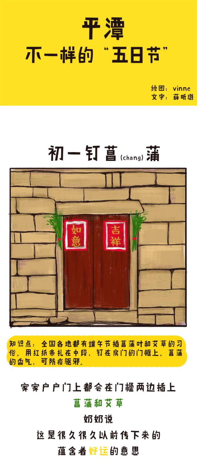 在古早平潭,老輩人把端午節(jié)當(dāng)年來過,因此儀式格外端重。五月初一,主婦們開始在大門邊掛觀音草和菖蒲等以示辟邪,各家各戶還忙碌著蒸包子,當(dāng)?shù)赝猎捊凶鳌白黾@”。初五是端午的正日,房前屋后噴雄黃酒,給小孩點(diǎn)雄黃,佩戴香囊。