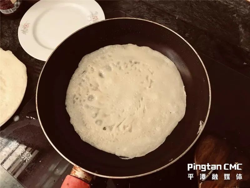 端午節(jié)吃面餅,攤面皮是第一步驟。面皮雖然相當(dāng)于餃子皮,但比餃子皮難做。面皮要做到皮薄細(xì)滑又有勁道,和面是關(guān)鍵。面粉加水,再根據(jù)比例加入適量的淀粉,打上雞蛋調(diào)均勻。有經(jīng)驗(yàn)的家庭主婦都懂得和面要提前兩小時(shí),面醒熟后做的面皮才更有韌性。