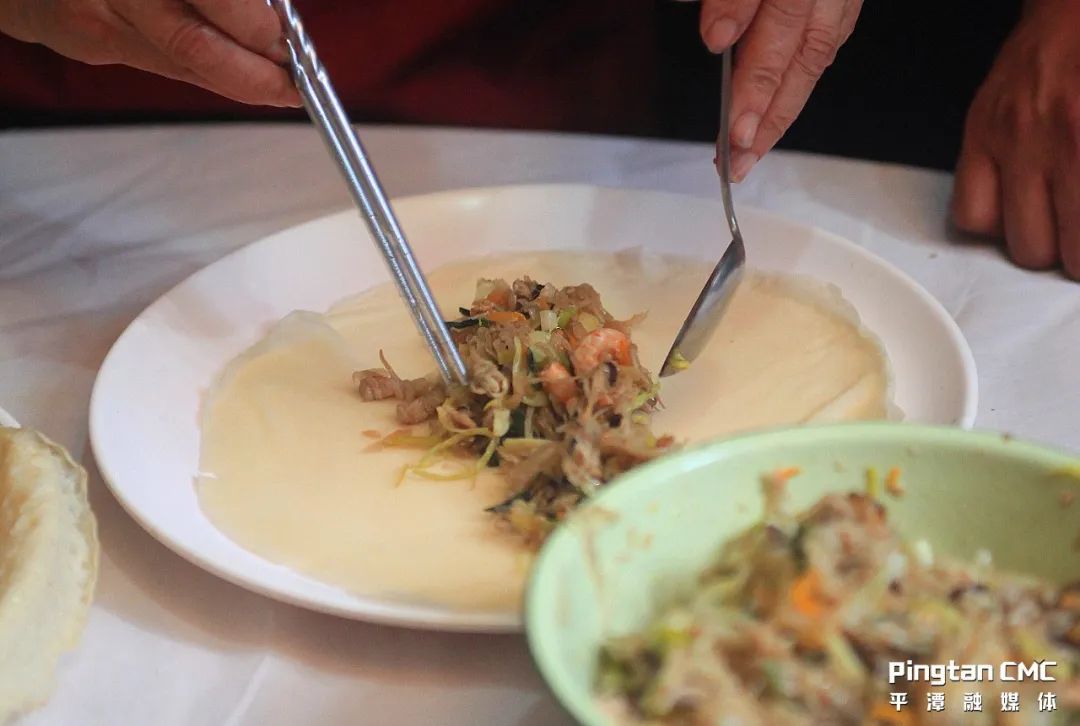 時至今日,盡管許多古早的端午民俗已在歲月沉淀中或演變或流失,但煎面餅的技藝卻被傳承下來,成為眾多海壇兒女心目中過端午節的“頭等大事”。所謂面餅,就是用面粉加水勾兌攤成餅狀,再用餅將海鮮、蔬菜等提前精心炒制的食材包裹起來。我猜想,大概是因為在早些時候,平潭作為海島孤懸海上,粽葉、糯米等做粽子的食材難以取得,于是先民們便用自己的智慧靈活變通,以一種原創獨特的食物取代了粽子。