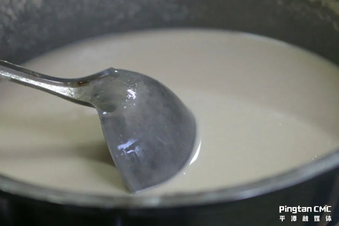 攤面皮有三個要點,一是火不能太旺,二是油不能太多,三是翻皮的時候動作要快,否則面皮會糊在鍋里。勺子舀面時,最好是均勻地倒在鍋里,且一勺就攤一張面皮,這樣的面皮才有賣相。