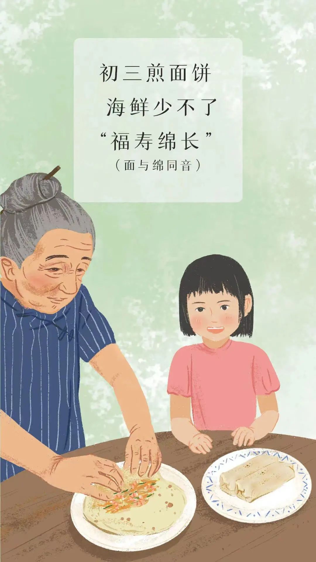 初一到初五,煎面餅成為家家戶戶的大事。吃面餅的時間自定,但做面餅的程序卻不能省略,這時候,海島上的家庭主婦幾乎都傾巢出動,到菜市場尋找包面餅的食材。
