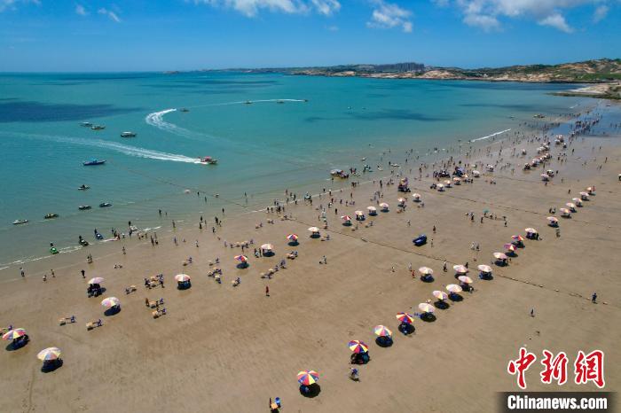 /7月2日,夏日炎炎,福建省平潭綜合實驗區(qū)龍鳳頭海濱浴場吸引眾多游客前來玩水避暑。(無人機(jī)照片)中新社記者 王東明 攝