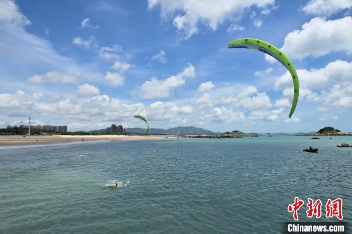 /7月2日,夏日炎炎,福建省平潭綜合實驗區(qū)龍鳳頭海濱浴場吸引眾多游客前來玩水避暑。圖為游客海上玩風(fēng)箏板。(無人機(jī)照片)中新社記者 王東明 攝