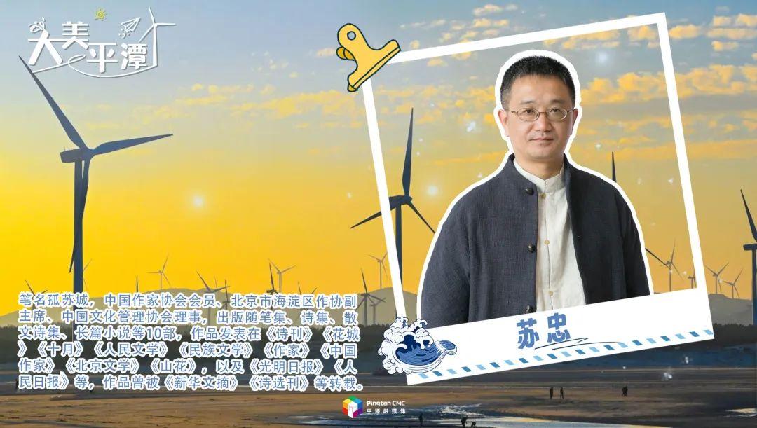 蘇忠,中國作家協會會員、中國文化管理協會理事、北京市海淀區作協副主席,出版散文集、詩集、散文詩集、長篇小說等10部,作品發表在《詩刊》《花城》《十月》《民族文學》《人民文學》《作家》《中國作家》《北京文學》,以及《光明日報》《人民日報》等。