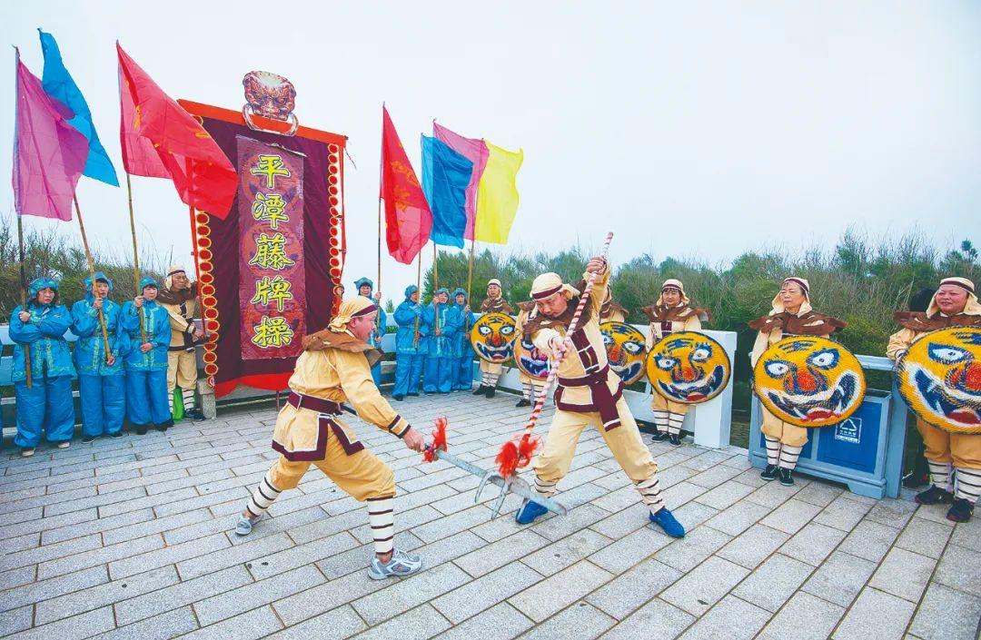 由戰(zhàn)場到舞臺,從軍事陣法到民間舞蹈,平潭藤牌操歷經(jīng)了400多年的風(fēng)風(fēng)雨雨。藤牌操又稱藤牌陣、藤牌舞,是一種始于明朝的傳統(tǒng)民間舞蹈,流傳于浙江省溫州市、瑞安市、平陽縣、蒼南縣和福建省平潭島等地。盡管形式“小異”,但內(nèi)容“大同”,都反映了華夏兒女堅韌不拔、抵御外侮的大無畏精神。