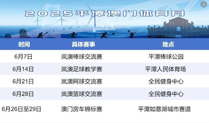 活動內容:平潭澳門體育月活動由平潭綜合實驗區體育總會與中國澳門奧林匹克委員會聯合主辦,包括嵐澳棒球賽、嵐澳足球賽、嵐澳網球賽、嵐澳籃球賽以及澳門房車錦標賽平潭站。