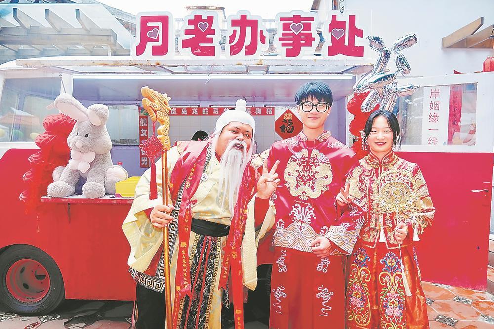 海峽兩岸特色廟會在廈門市集美區后溪鎮城內村舉行,吸引了許多市民游客參與體驗。圖為網紅打卡點“月老辦事處”為游客送祝福。(資料圖片)